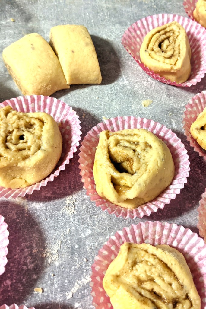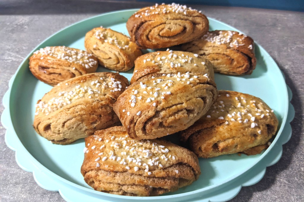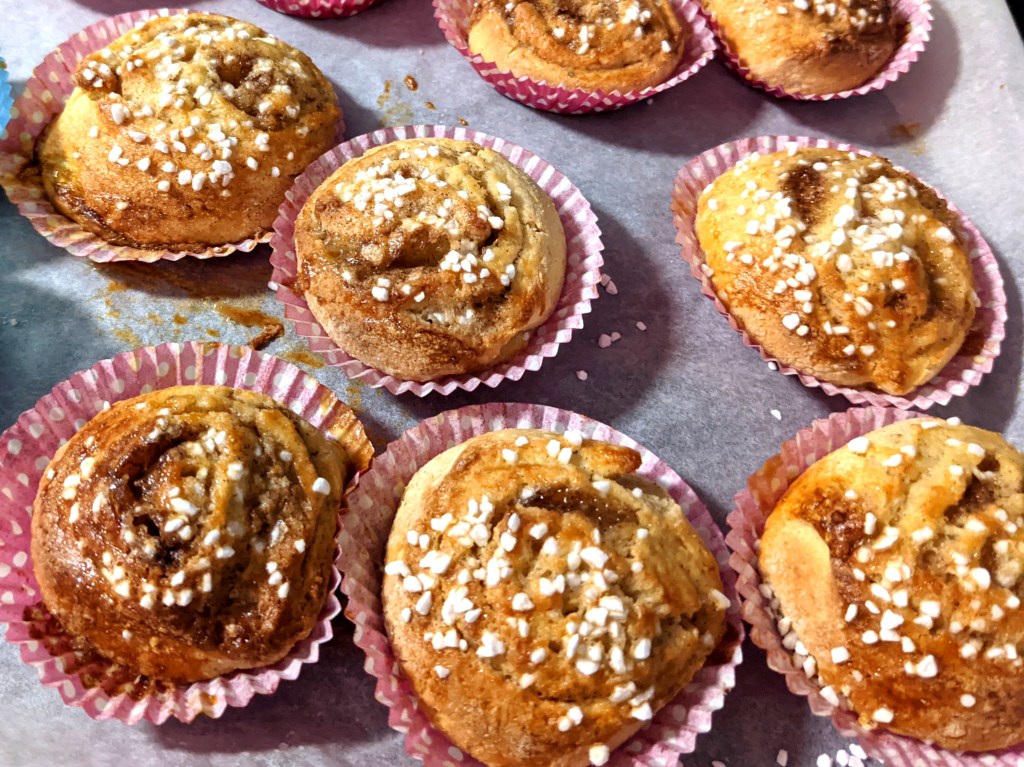 I have to give a bit of a disclaimer. The Finnish traditional cinnamon buns are baked into a different shape than the Swedish ones. They are called “A slap on the ear” (‘korvapuusti’ in Finnish) and they do look like an ear. I have succesfully made them with this dough, but what I have found is that with the gluten-free dough, it is better to restrict the dough with a casing so that the dough rises up instead of spreading to the sides because the supporting network coming from the egg and psyllium husk is not as strong as the one in the traditional buns with gluten. If you just can’t tolerate making Finnish cinnamon buns and baking them in a paper cupcake casing, do make sure the dough is quite firm to prevent the buns spreading out and not getting a nice rise.