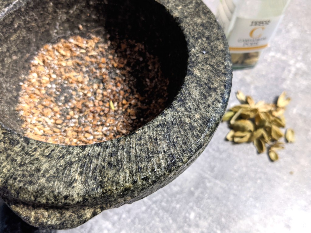 | 1-2 tbsp | ground cardamom seeds (break the cardamom pods with a mortar and pestle, remove husks and grind the seeds so that there’s not too many whole seeds) |