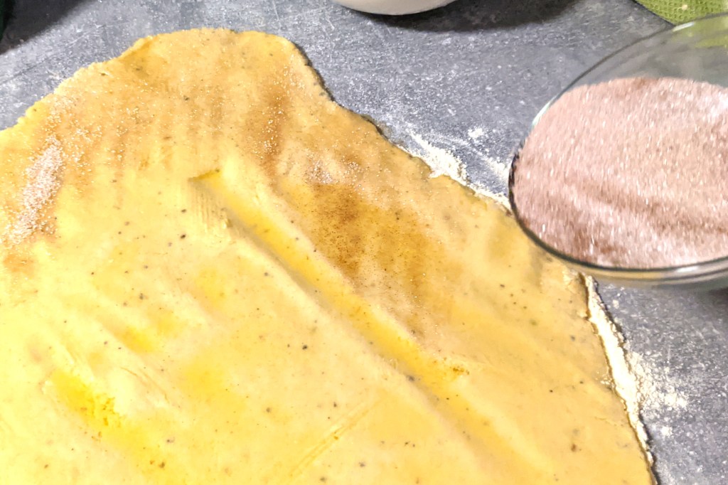 - Mix the cinnamon in the sugar and sprinkle generously on the sheet.