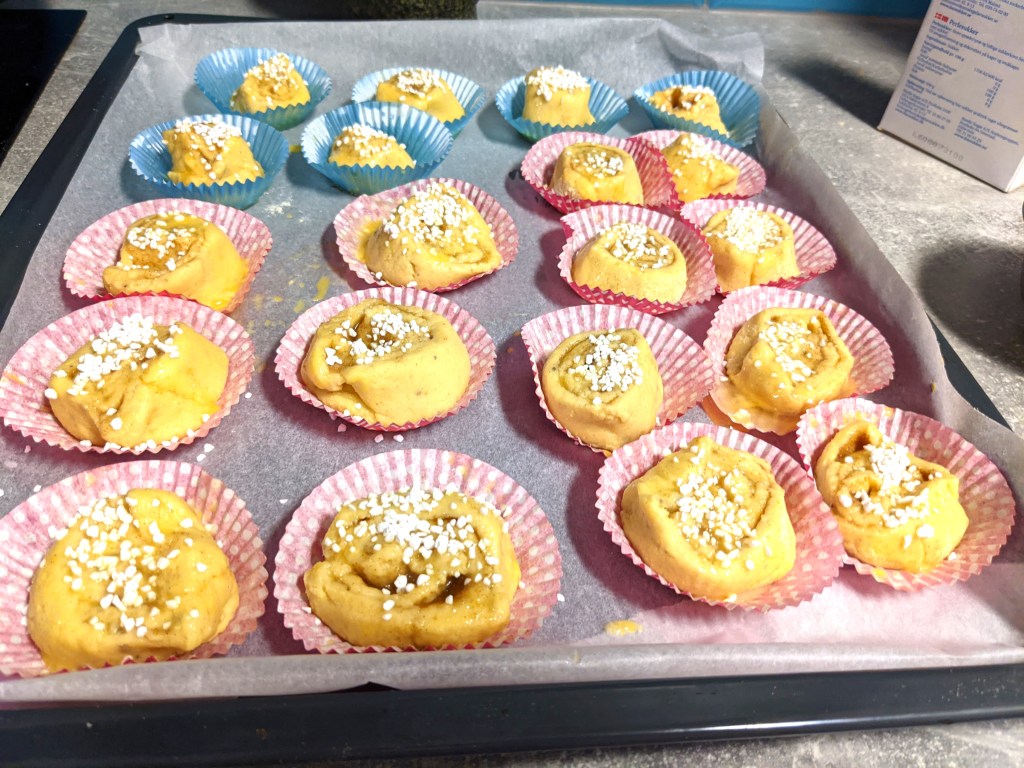 The buns will rise more in the oven, if you want to give them 20-30min to prove before you put them in the oven that is ok, but if you are in a rush you can also bake them straight away after washing with egg and sprinkiling with pearl sugar, almond flakes or chopped almonds. Just regular caster sugar is also ok if you are running out of options.